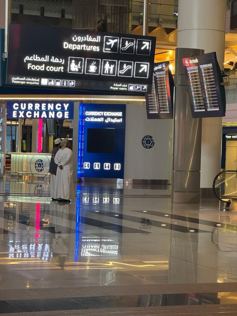 Daarna regelt Roelof de lokale simkaarten voor onze telefoons en gaan Nienke en ik geld halen. Op de telefoon zit een nieuwe functie bij rekenmachine waarmee je makkelijk kunt converteren. Nienke heeft het ontdekt en liet het ons in Quatar zien. Roelof zegt nog dat we het met 2,5 moeten omrekenen, maar ik ben moe en denk we gebruiken de rekenmachine wel. En op mijn vraag hoeveel moeten we meenemen, “zoveel mogelijk”. Nienke rekent voor dat wat Roelof zei niet klopt dan hebben we bijna niets. En dan weigert haar creditkaart onze vraag om 500 omani rial, omdat haar limiet het niet toelaat. Haar andere kaart idem. Er zijn 3 machines overal hetzelfde probleem. Man dit is toch niet grappig. Dus dan probeer ik het maar, 500 lukt, maar onze rekenmachine deelt door 5 en dus denk ik “dat is echt niets” en ik neem nog 500. Helaas maakten we een minuscuul foutje: de Quatar rial deelt door 5 naar de euro. De Omaanse rial moet je maal 2,5 doen. Laten we het vrolijk stellen: we hebben voldoende cash voor de komende 10 dagen.