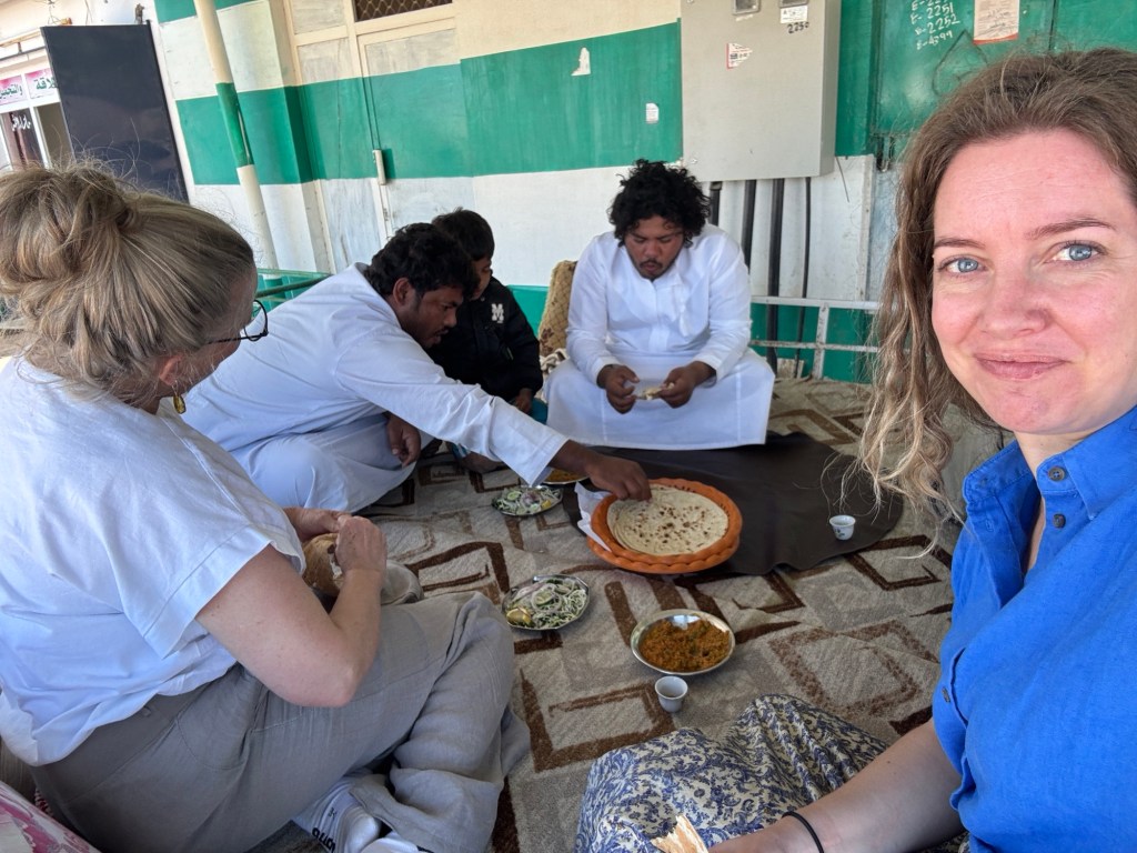 We hebben heel veel zin in koffie, maar als we uitstappen worden we uitgenodigd bij twee mannen en een jongetje die buiten zitten te eten. We worden aan tafel gevraagd en voor we het weten eten we dahl en Omaanse pannenkoek (en voor ik het weet heb ik een klodder dahl op mijn witte shirt). Hoe doen Omani dit, hebben zij nooit zere knieën? Maar vooral, hoe leuk is dit?
