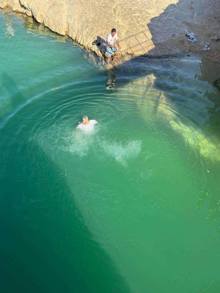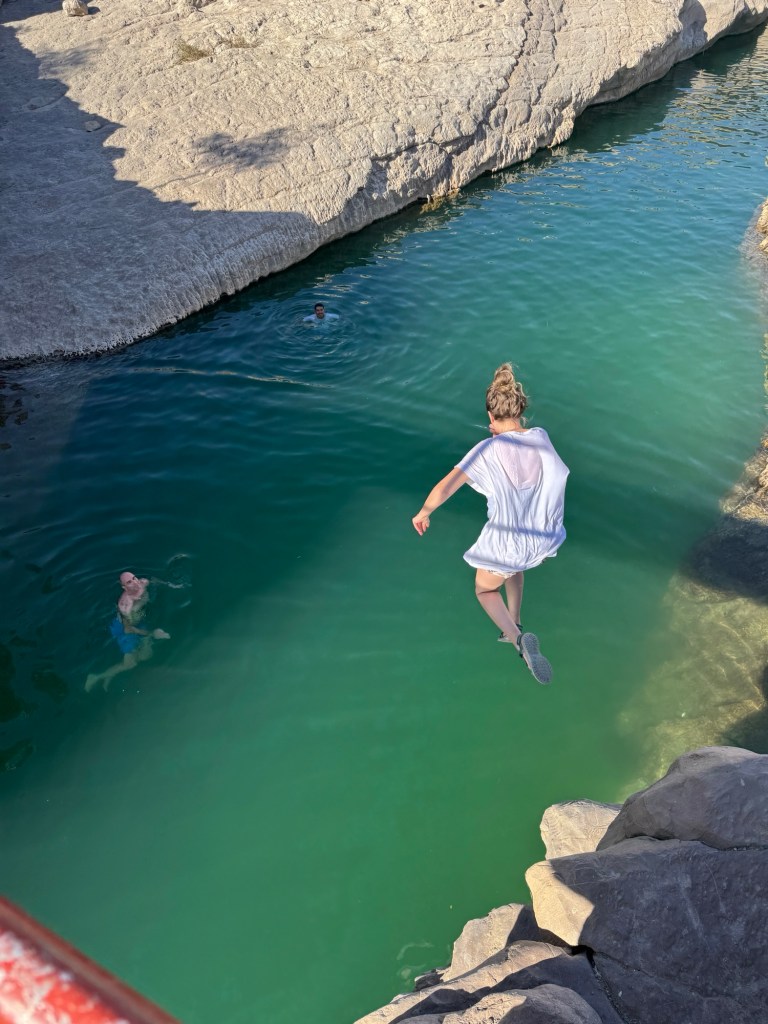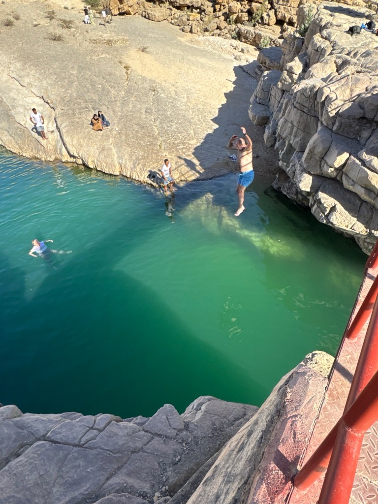 Door naar Wadi Bani Khalid. Ik bedenk dat nog een keer zwemmen niet handig is. Maar als het water dan prachtig blauw is en een Omaanse springer vraagt om te springen…. Mooier bedekt dan in een lange linnen broek wordt het niet. Het water is perfect van temperatuur. Roelof en Nienke volgen. Heerlijk.