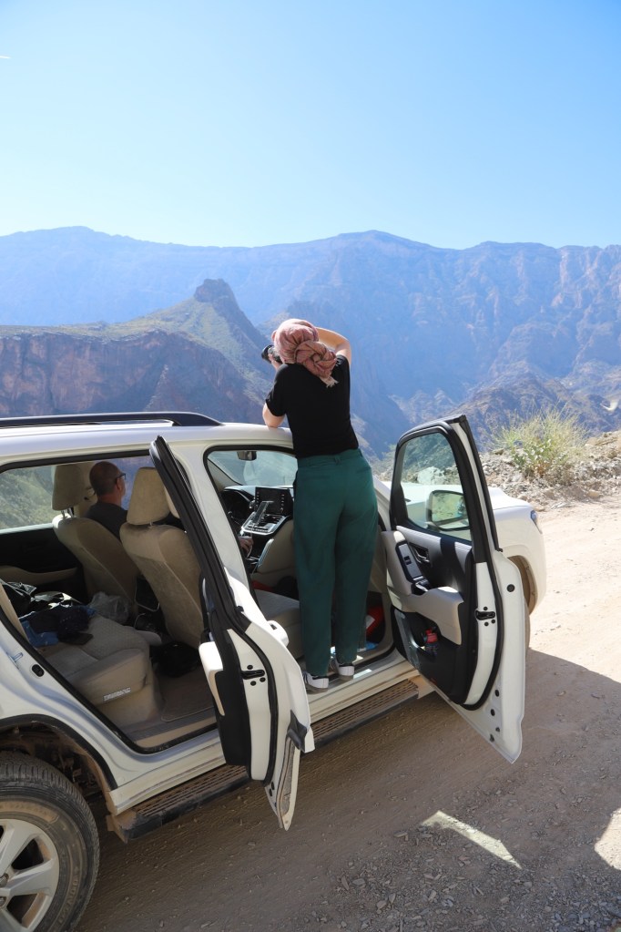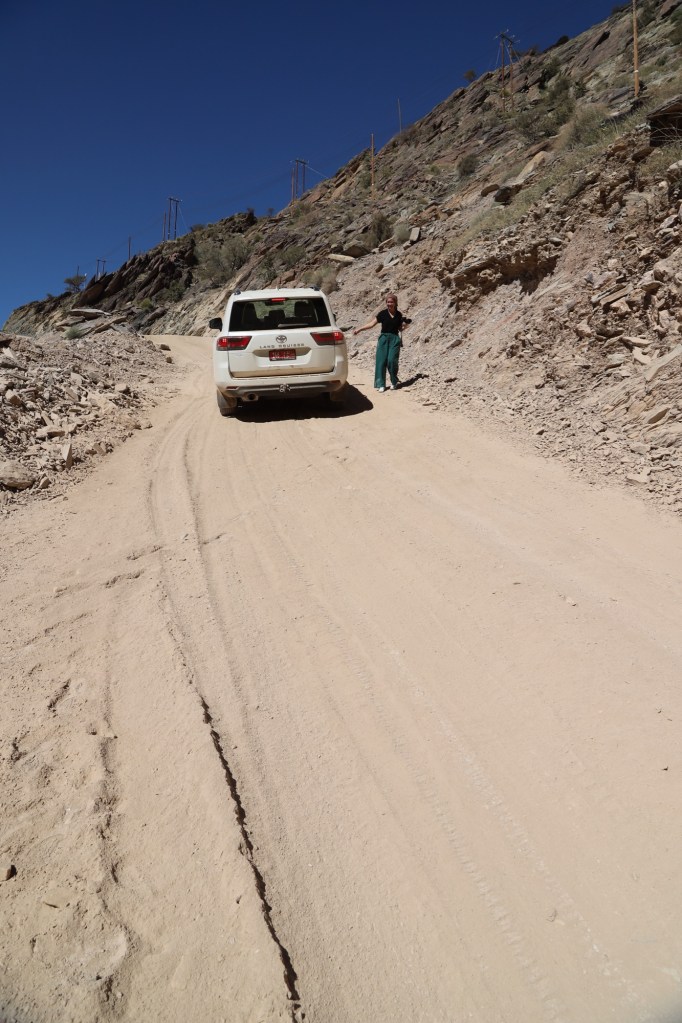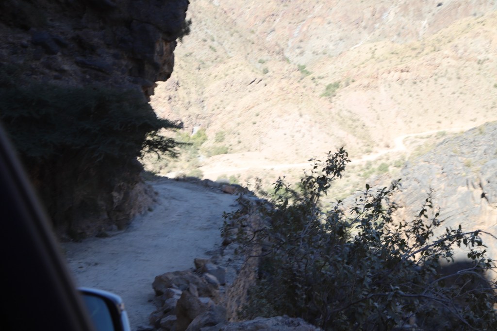 Daarna op weg naar Rustaq. “Ik heb de scenic route ingesteld” vertelt Roelof. “Gelukkig”, zeggen wij: “want die snelweg gisteren was inderdaad wat saai” Hoe dan Roelof? wat betekent deze zin. Maar na 200 meter snappen we het: een nog smallere weg, losser zand en nog steiler. This better be good!