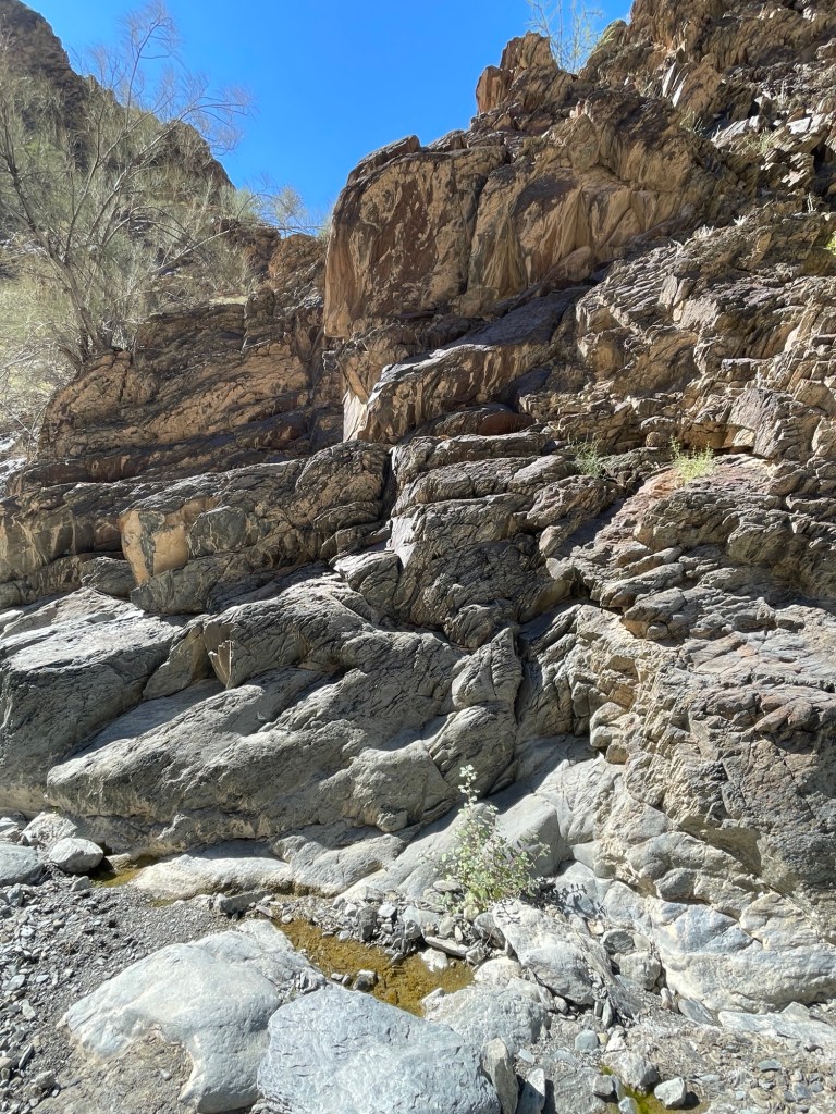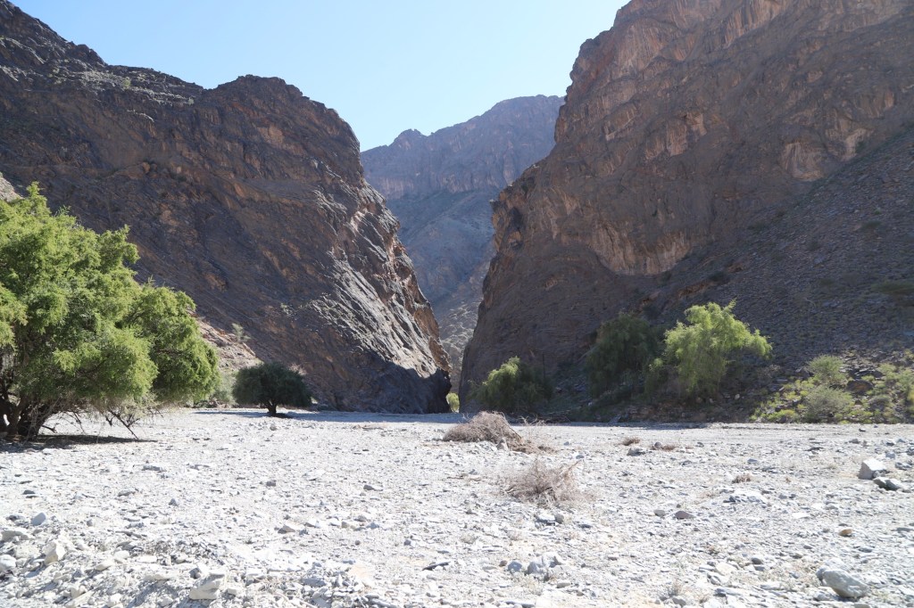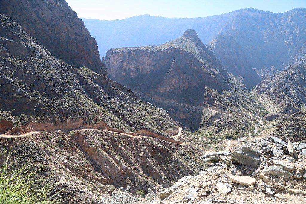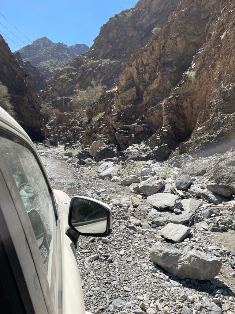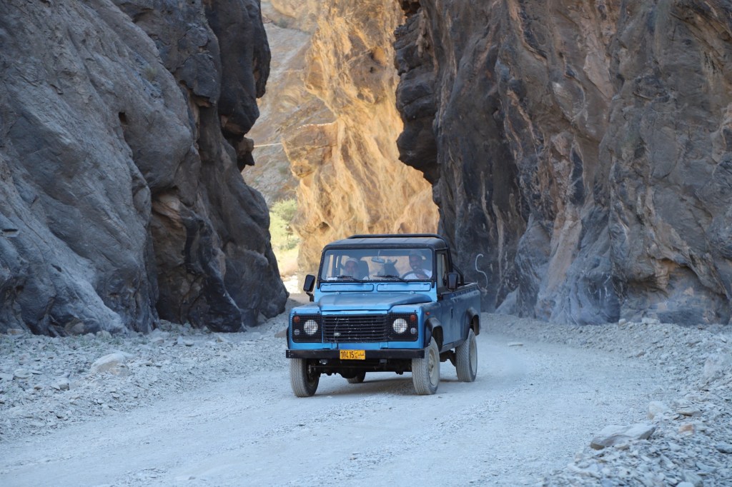 En dan wordt het opeens veel weidser en moeten we tussen twee massieven door. Het is prachtig en dan komt er een blauw Jeepje met twee Omani en een geit. Die breed lachen en zwaaien. En ons the thumps up geven. Maar ze zijn dan ook onze enige tegenliggers op dit hele pad waar we niet sneller dan 10 km per uur konden. Het is het gebied van Snake gorge en valley cutting, maar wat wat is daar komen we niet achter