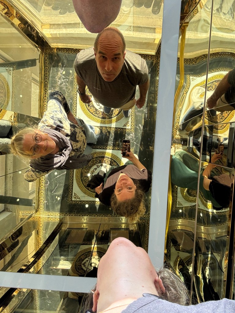 Er zijn weinig mensen buiten. Maar als we onszelf totaal vastgelopen hebben worden we geholpen door een aardige jongeman. We blijken door een dicht hek te moeten. Dat hadden we nooit zelf bedacht. De toren is niet heel groot en de trappen zijn een uitdaging.