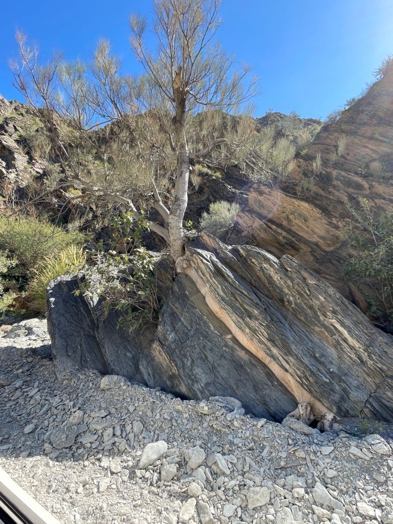 Maar waanzinnig wat een weg! Eerst heel veel klimmen en dalen maar wat een uitzichten! Daarna rijden we door een rivierbedding, zelfs wat vochtig op sommige plekken. En de bomen boren zich door de stenen heen. De leistenen verkruimelen als stro. De muren naast ons veranderen iedere keer.