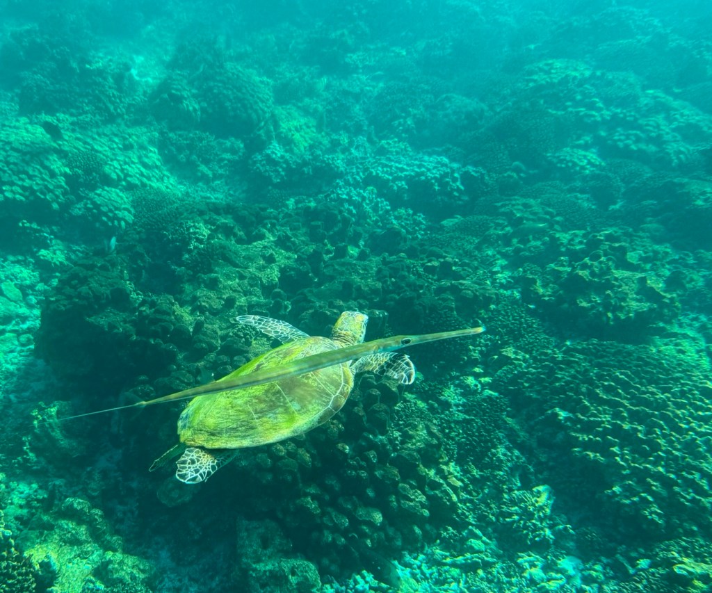 We hebben 1 duiker en 5 snorkelaars. Het water is kouder dan gisteren. Helaas is ook hier het rif bemost en niet in opperbeste conditie. Er is wel veel vis. Prachtig. Weer schildpadden, een barracuda, kogelvissen, papegaaivissen, grote trompetvissen, gele koraalvlinders. En wolken kleine visjes, in allerlei soorten en maten. Trompetvisbabies zwemmen ook in grote groepen net onder het oppervlak. En ik heb even met een wolk sardientjes kunnen spelen, van alle vissen word ik daar het blijst van. Samen met de rustig peddelende schildpad met stip op een gedeelde eerste plaats.