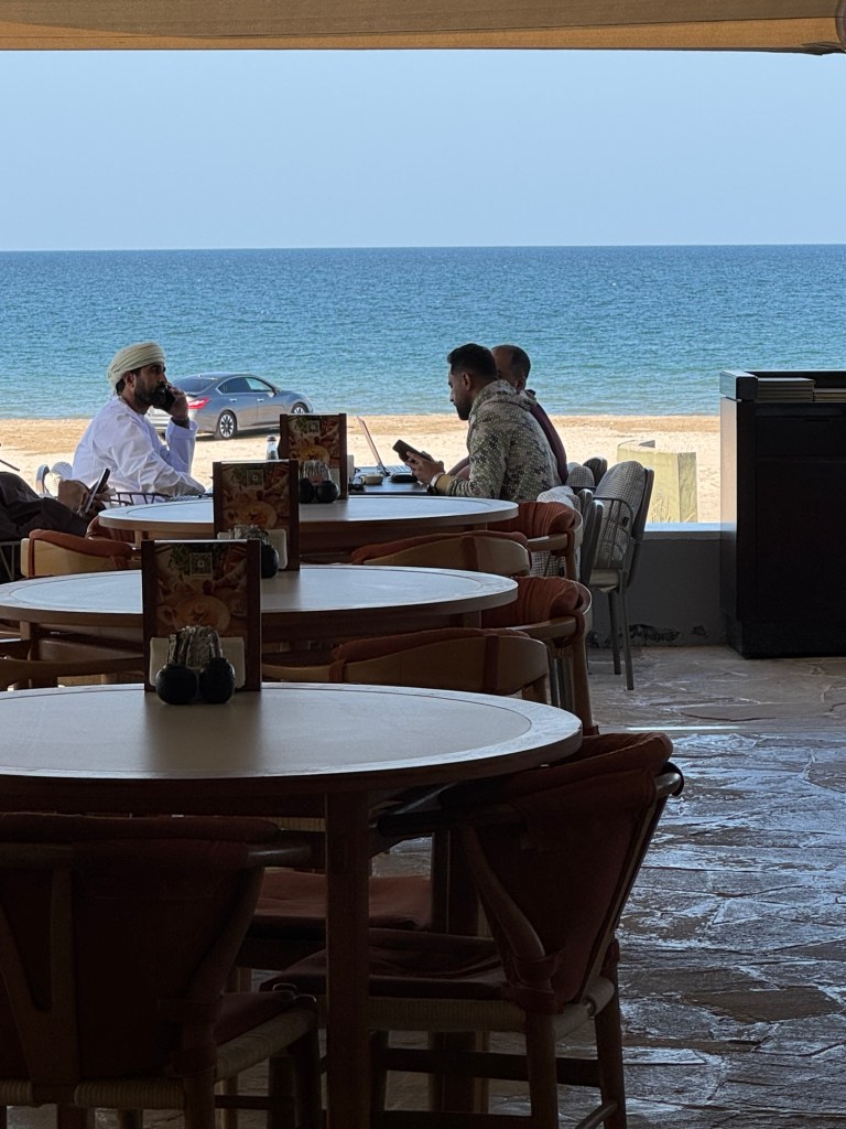 Nu onze laatste maaltijd in Oman in een restaurant aan het strand. Heerlijk tonijnsteak. Vannacht vliegen we terug.