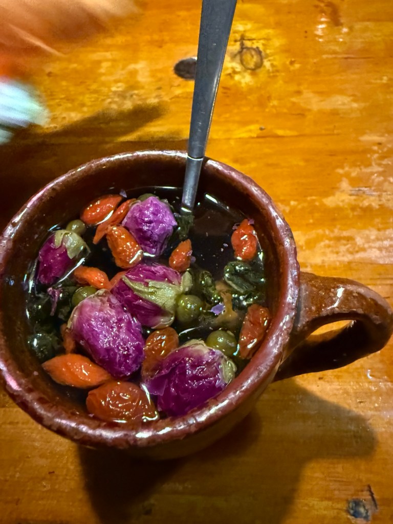 Toen het etenstijd was voelde ik me zachtgroen. Maar jullie kennen me volgzaam als ik ben toog ik met de mannen naar beneden om wat te eten. Saag paneer. Een soort soep van spinazie. Met wat naan erbij. En eerlijk is eerlijk: ik knapte er van op. En daarna dronk ik de thee die ze hier adviseren voor hoogteziekte. Weet niet of het hielp maar het zag er wel mooi uit.