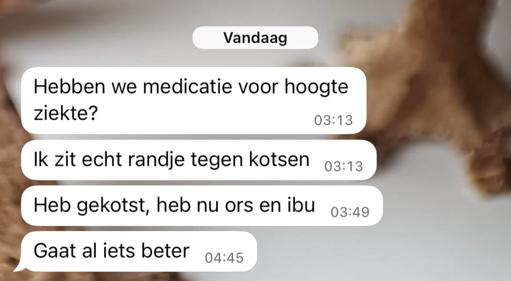 Thijmen deed het nog een graadje erger met overgeven erbij. what’s app is een soort roulette hier met wel of niet doorkomen van berichten en onderstaande berichten kreeg ik bij het ontbijt. Jelmer heeft voor Thijmen gezorgd.
