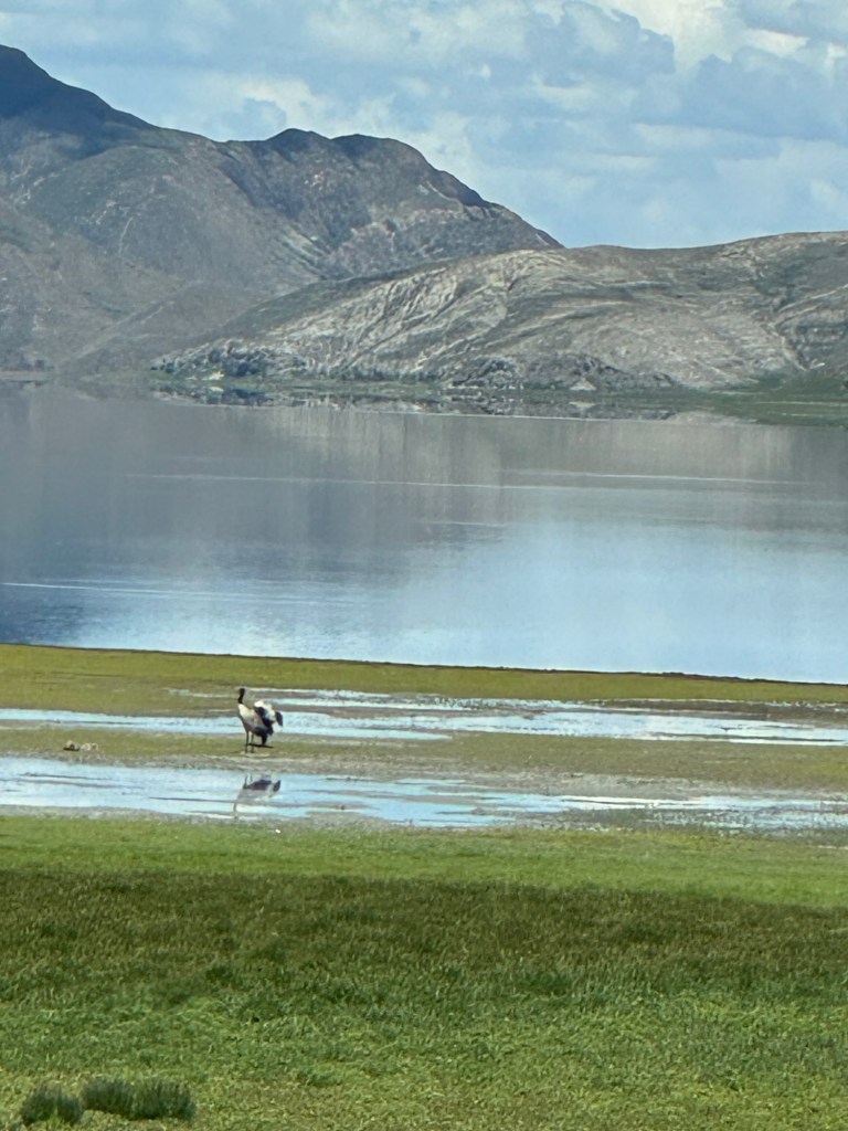 De zwarthalskraanvogel is in Tibet van maart tot oktober. De gids zoekt ook als we het hem vragen, maar we hebben geen permit waar ze zitten. Roelof kijkt ook en vindt uit dat ze ook rond dit meer aanwezig moeten zijn. Eerst ziet Thijm er twee vliegen, daarna ik één, maar niet duidelijk genoeg om een foto van te maken. En dan zie ik er twee in het land, we zitten te juichen in de auto. De driver zet de auto aan de kant en als ik de foto maak hebben ze ook nog twee kuikens. Wat onvoorstelbaar tof.
