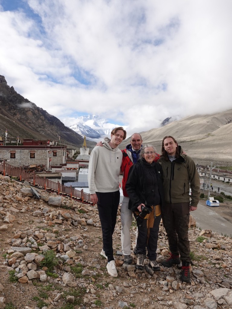 We lopen richting Everest om een foto zonder mensen en zonder elektriciteitsdraden te maken. Dan blijkt de gids Thijmen in beweging te hebben gekregen (respect) en moet er een familieportret voor de berg komen. De gids maakt echt leuke foto’s van ons.