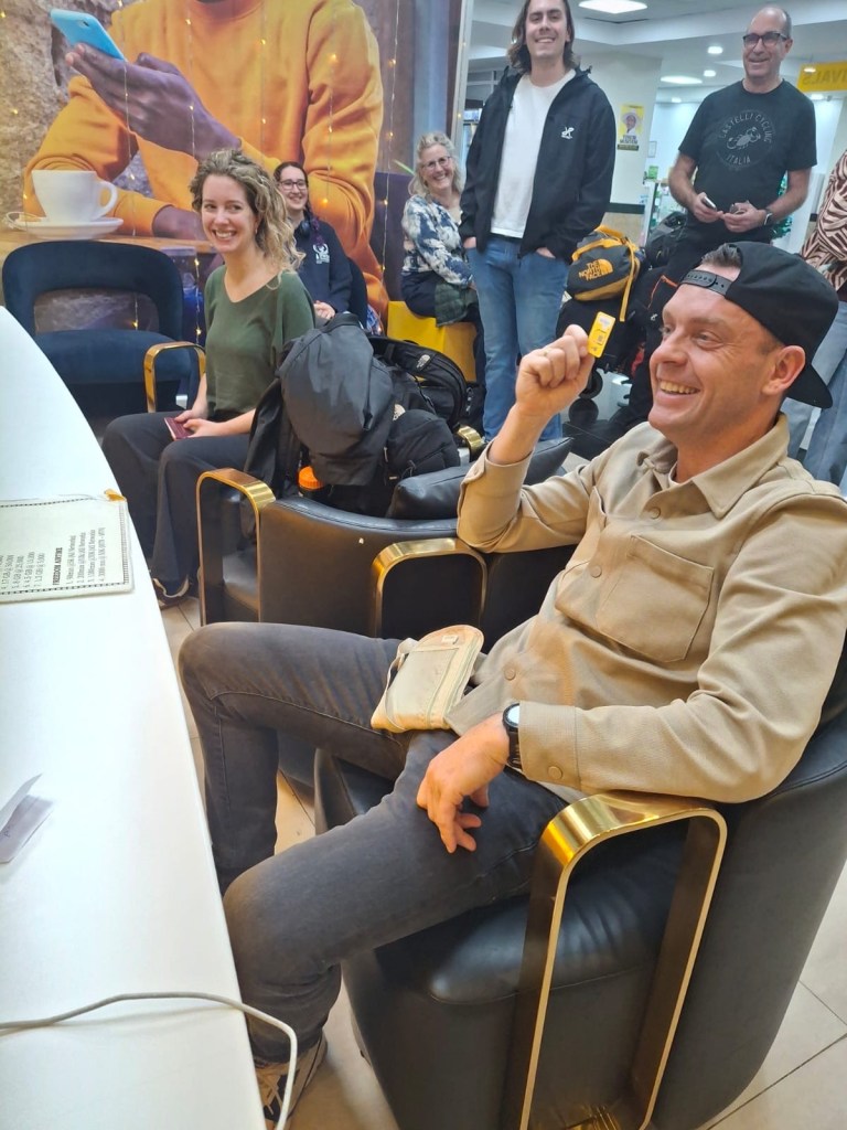 En dan zijn we er, 2 uur plaatselijke tijd. We besluiten nog een telefoonkaart te kopen, dat was misschien niet ons slimste besluit. Het tempo ligt mild gezegd laag. De twee dames die helpen staan nog in slaapmodus. We moeten de kaart omhooghouden voor een foto. Niet onze beste.