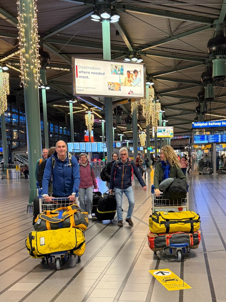 Om 5.45 uur gaat de wekker. Strak om 6.45 uur zijn Henk en Rita er, alle tassen kunnen in hun auto en dan gaan we richting Schiphol. Pas daar leren we elkaar allemaal kennen Henk en Rita en hun zoons Roy en Michel, Nienke en wij met Jelmer en Jasmyn. Zoals Henk verzucht “Jammer dat Thymen (en Lisa) er niet bij is.”