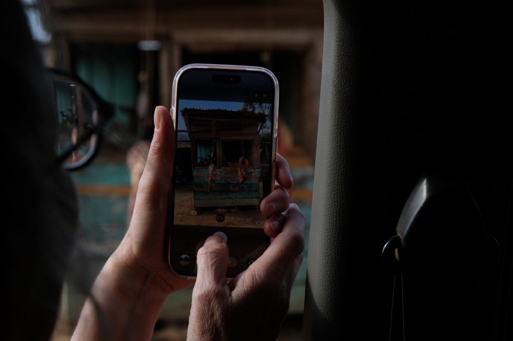 We verkijken ons op de tijd, blij denken we we zijn er bijna, maar 27 kilometer, blijken dat miles te zijn en met deze weg is dat ruim een uur. Nienke en ik vermaken ons met heel veel foto’s uit een rijdende wagen, waarmee we dan de anderen spammen. Het is ook goud. Denkend in fotoboeken; zeker 4 bladzijden.