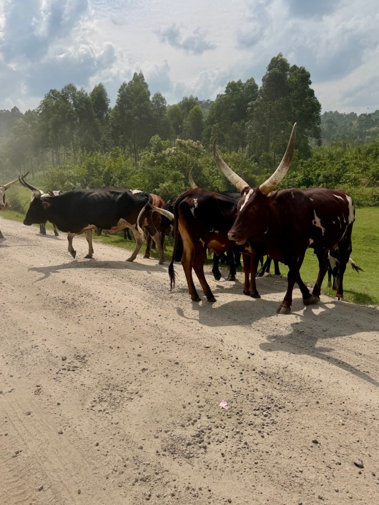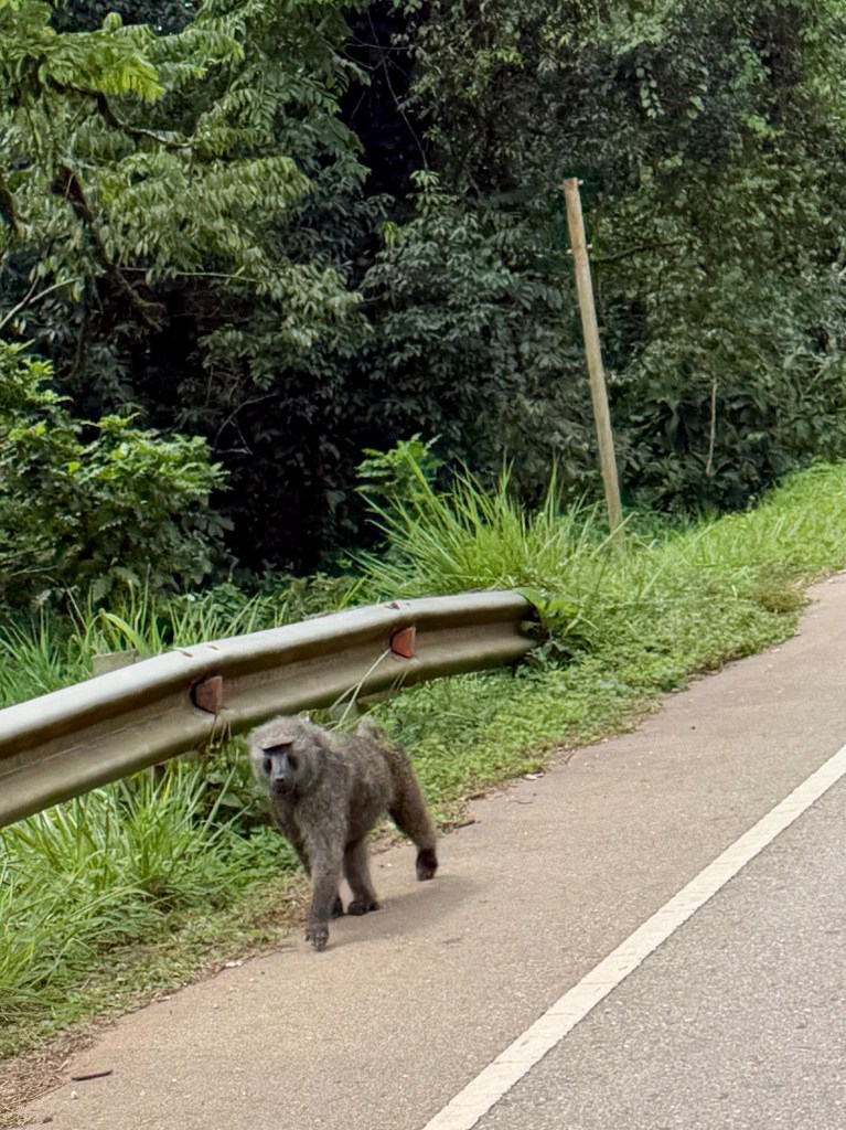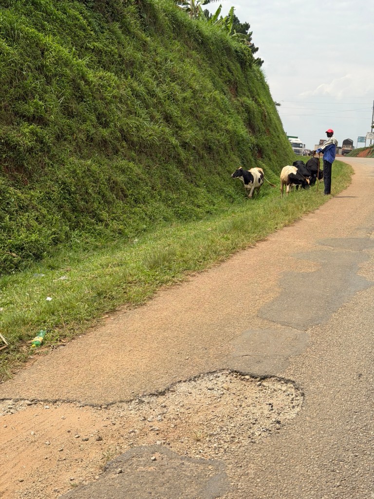 De weg is inderdaad voor een groot deel under construction. Gaten soms waar je een koe in kwijt kan (Henk). Die komen we trouwens ook tegen onderweg. En bavianen, die ik nog steeds een beetje eng vind.