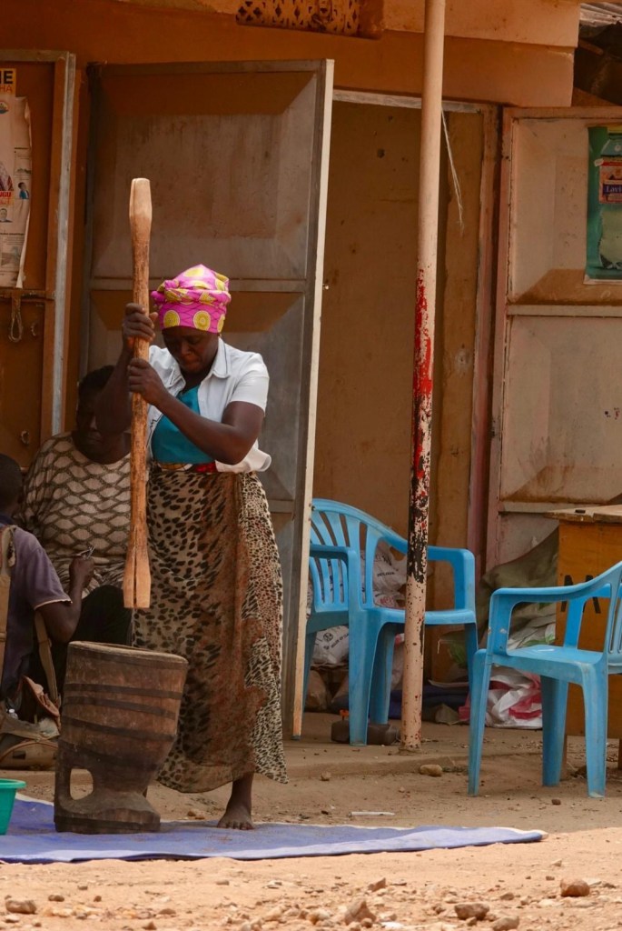We zijn op tijd en wachten samen buiten tot ze komen. Wat een heerlijke plek. Een jongen speelt met een band. Een vrouw maalt meel.