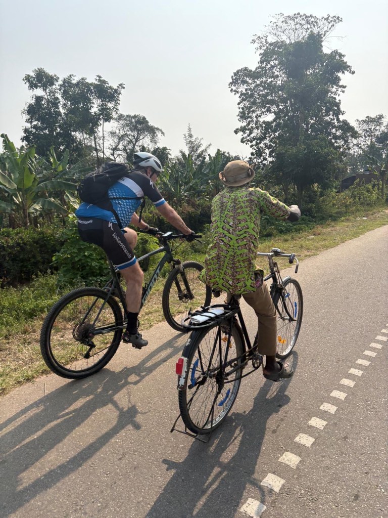 Wij genieten van hun enthousiaste verhalen. Wat ze zien op en langs de weg. De baas op de fiets zonder versnellingen, die rustig 5 minuten mee peddelt is duidelijk een hoogtepunt.