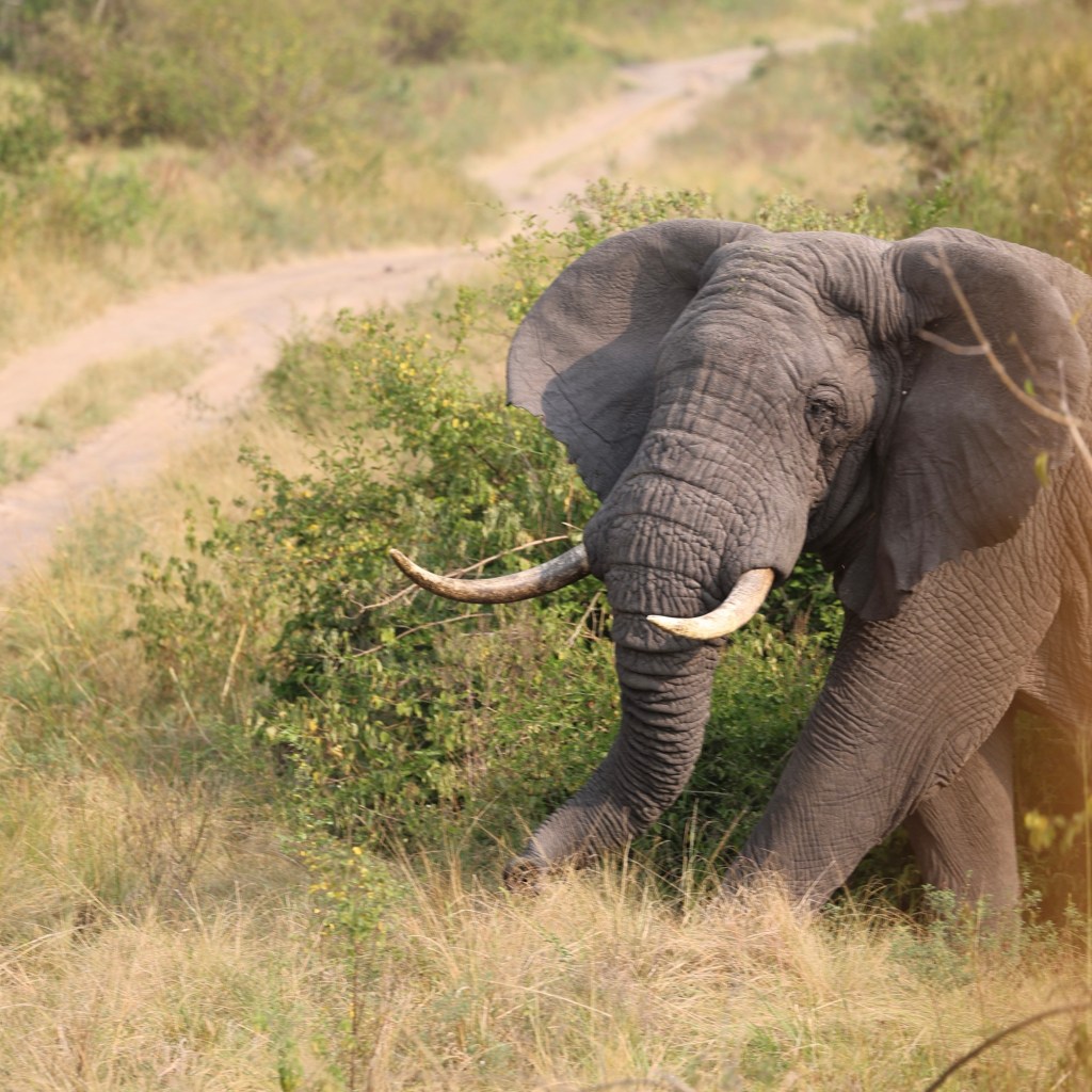 Als laatste vlak voor we het park uitgaan zien we een olifant. Een grote man. Indrukwekkend. Als hij tegen onze tegenligger met zijn oren gaat wapperen en ze blijven staan denk ik “shit nee, dit wil ik niet in het echt zien.” Maar dan rijdt hij gelukkig door en loopt de olifant verder of er niets aan de hand is.