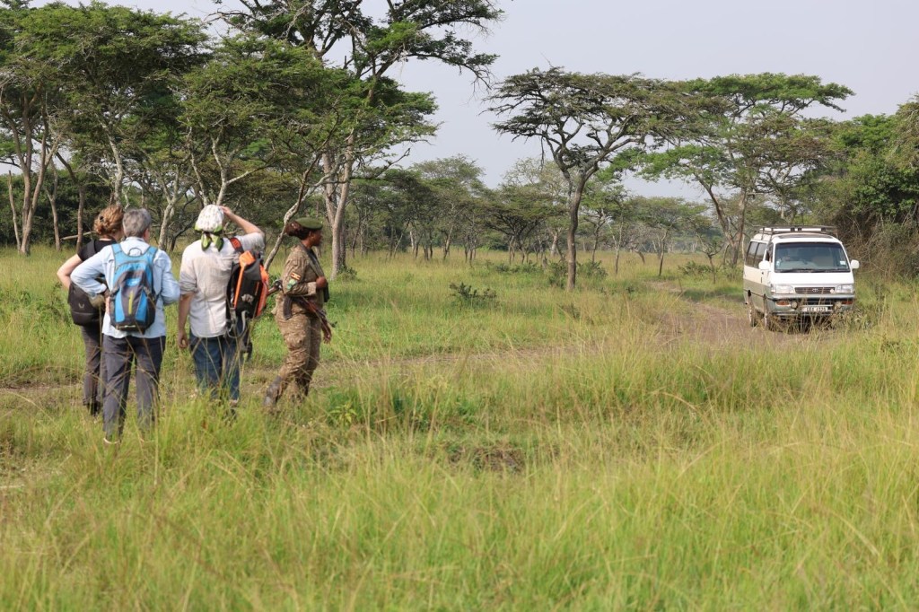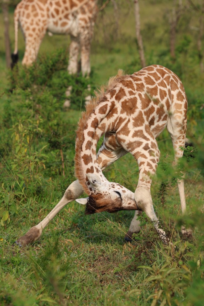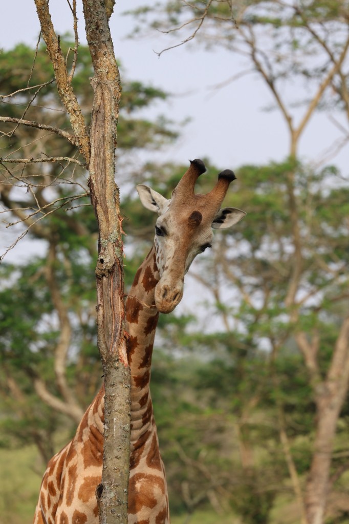Ze zijn rustig tussen giraffen doorgereden. De giraffen leefden hier oorspronkelijk niet maar om de overvloedige acaciabomen en zaailingen, die hier zeer goed gedijen, terug te dringen is de giraf hier ingevoerd. Ze eten jonge boompjes en schillen de bast van de grotere bomen. Beide acties zorgen voor minder acacia’s. (Trouwens de acacia met zijn enorme stekels was ook de struik waar Jelmer in landde.) Iedereen is onder de indruk van deze vriendelijk reuzen.