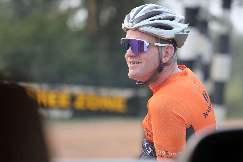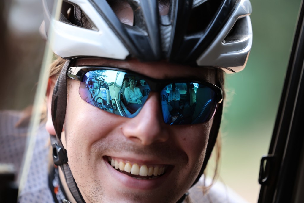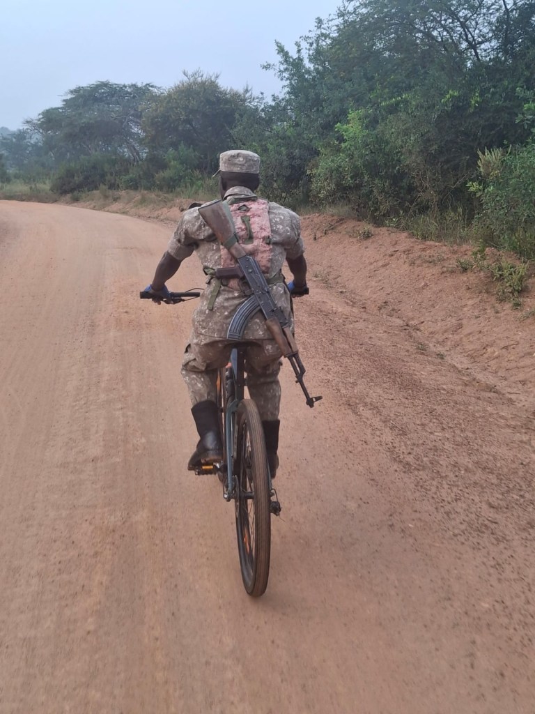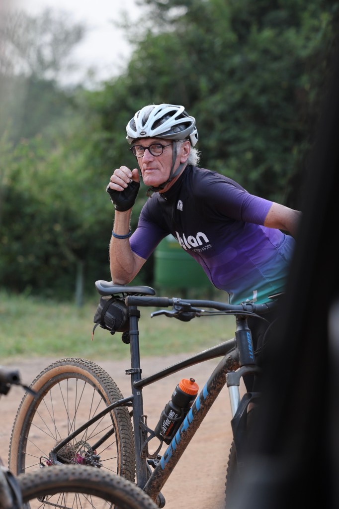 De mannen gaan door het park fietsen. Hun gids, met geweer van 5 kg op de rug, op laarzen, met gewone trappers, ook op de mountainbike. Ze beginnen met een steile helling die ze allemaal opknallen, waarna ze geslaagd zijn voor de lange route.