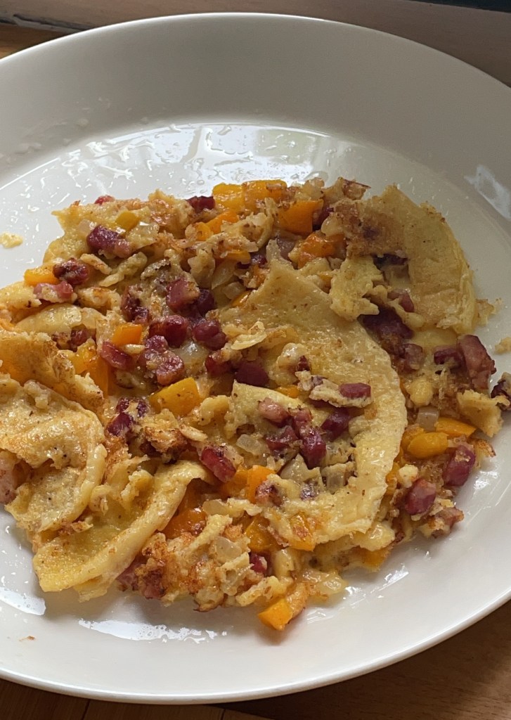 Omdat we vonden dat broodjes ei echt het best zijn onderweg, gaan we die bakken. De pan die ik kies heeft een hekel aan eieren en scrambled eggs op een broodje is niet heel handig. Bram bedenkt een oplossing. Andere pan, nog een ei klutsen, door de scrambled eggs mengen, bakken en klaar.