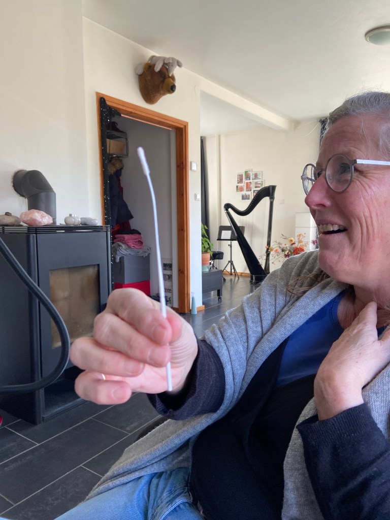 Nieuwe Coronatesten: we zijn gehoorzaam en negatief in alle opzichten. Ook over de afname. Daan nam die van mij af. Best moeilijk tips geven met zo’n ding in je neus. Wat nasaal zei ik dat hij wel door moest raggen. Maar ik bedoelde niet dat hij dat ding er bij mijn oog weer uit moest laten komen. (Het stokje was recht voor de afname.)