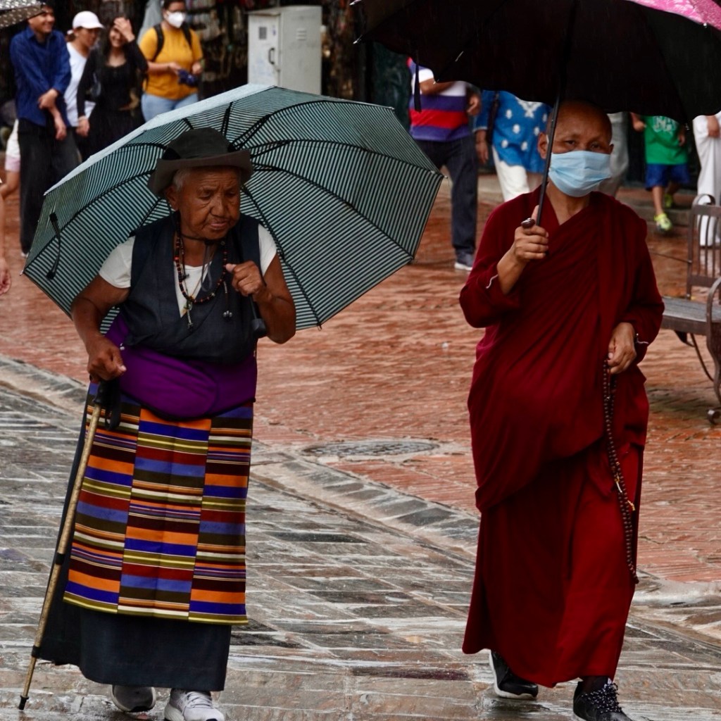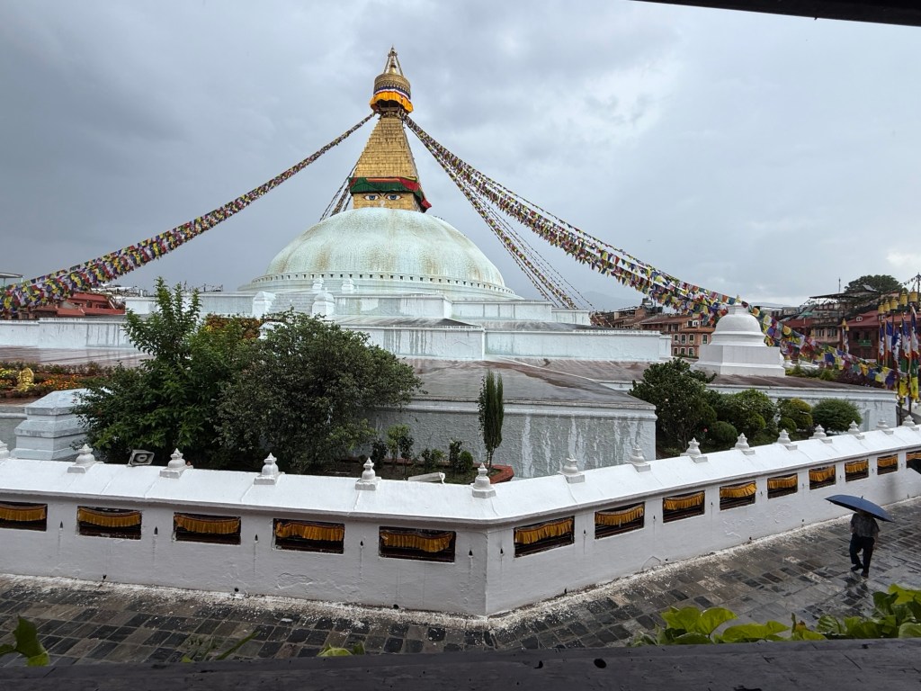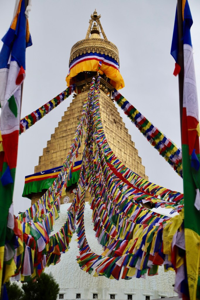 We kunnen op het eerste dak. Je staat onder de vlaggen en het is indrukwekkend: Het ruizen van duizenden gebedsvlaggen. We lopen een rondje met de klok mee en dan gaan we snel bij een café binnen met uitzicht op de stupa omdat het stortregent.