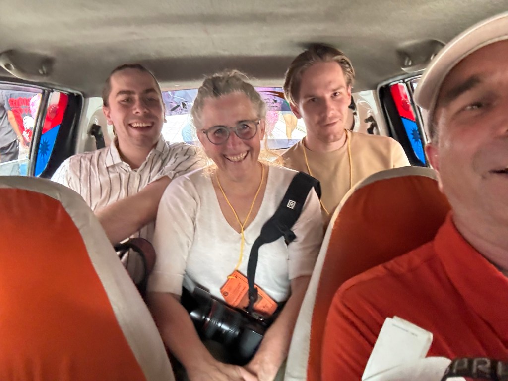 We gaan even iets afgeven bij familie van de driver. En daarna gaan we door om te lunchen. We maken contact met medegasten en voor het eerst mogen foto’s. Heel leuk. Mensen gaan helaas serieus kijken voor een foto. Een klein jongetje is gebiologeerd door Roelofs beharing.
