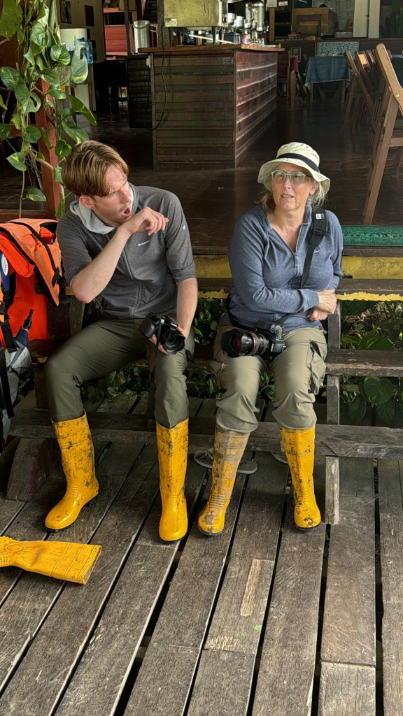 Het is hier op veel plaatsen blubberig. Dat betekent dat onze wandelbroeken bijna uit zichzelf rechtop blijven staan. Met het oog op bloedzuigers moeten we hoge sokken om onze broek doen en dan in laarzen. De sokken staan ook klaar voor gebruik. Ik had wel veel lage mee, dacht dat is wat koeler maar dat ene paar hoge is echt slimmer. Dus draag ik ze met elke wandeling.