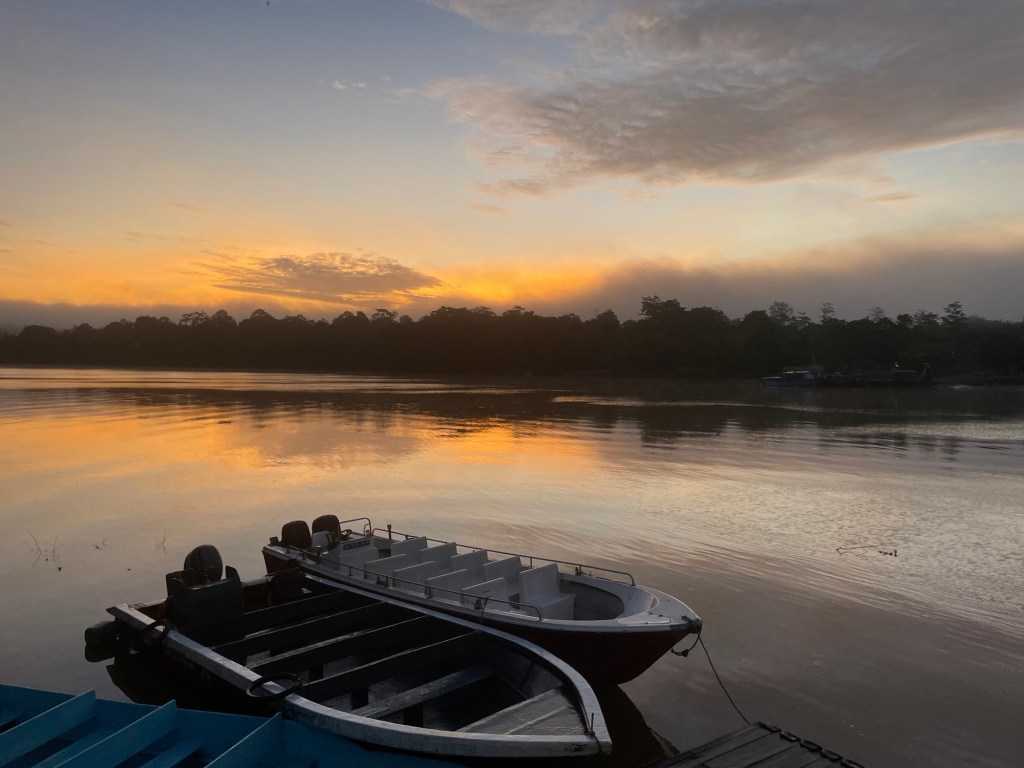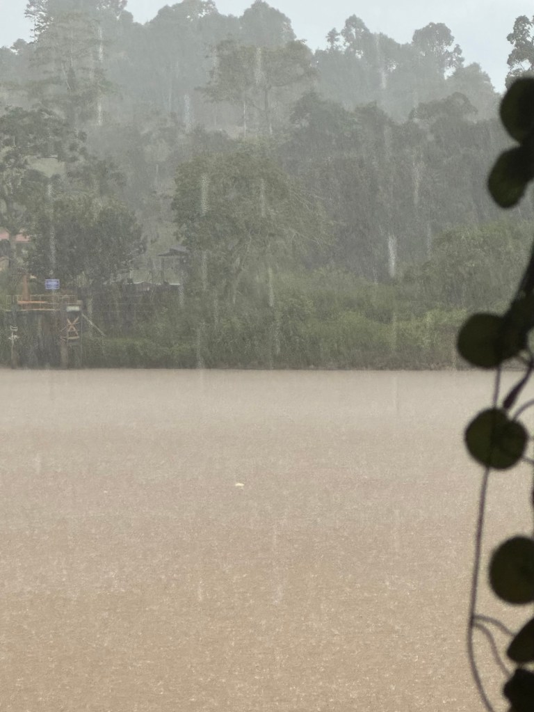 Na het ontbijt een junglewandeling. het is zo onvoorstelbaar warm dat het vocht in straaltjes van ons af loopt. We hebben gezien het aantal muggen dan ook onze nosilife lange broeken en hoodies aan (gedrenkt in antimuggemiddel). De gids vertelt ons over planten, bomen, medicatie en het verdrijven van geesten. Met laarzen en nat sliertig haar voel ik me net ma Flodder. We zijn helemaal kledder van het zweet als we terugkomen.
