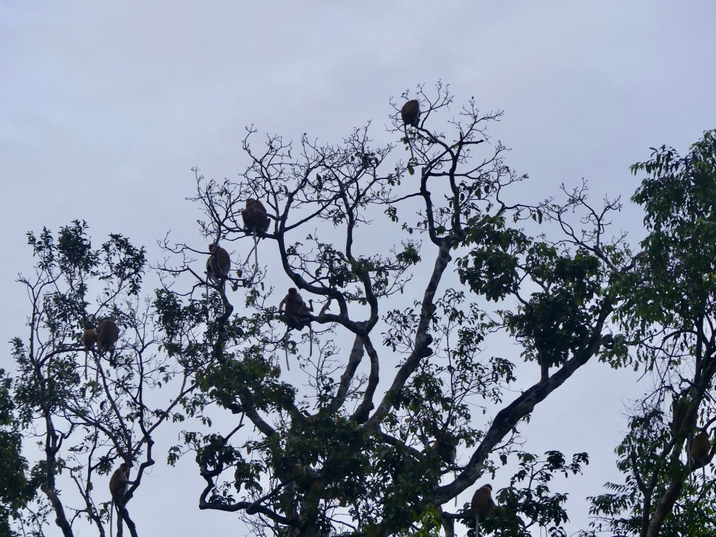 Maar vandaag zittend op het terras bij de eetzaal met een kop thee zien we red leaf monkeys, makaken, een ijsvogeltje en eekhoorns. En raakt al het klein leed wat op de achtergrond.